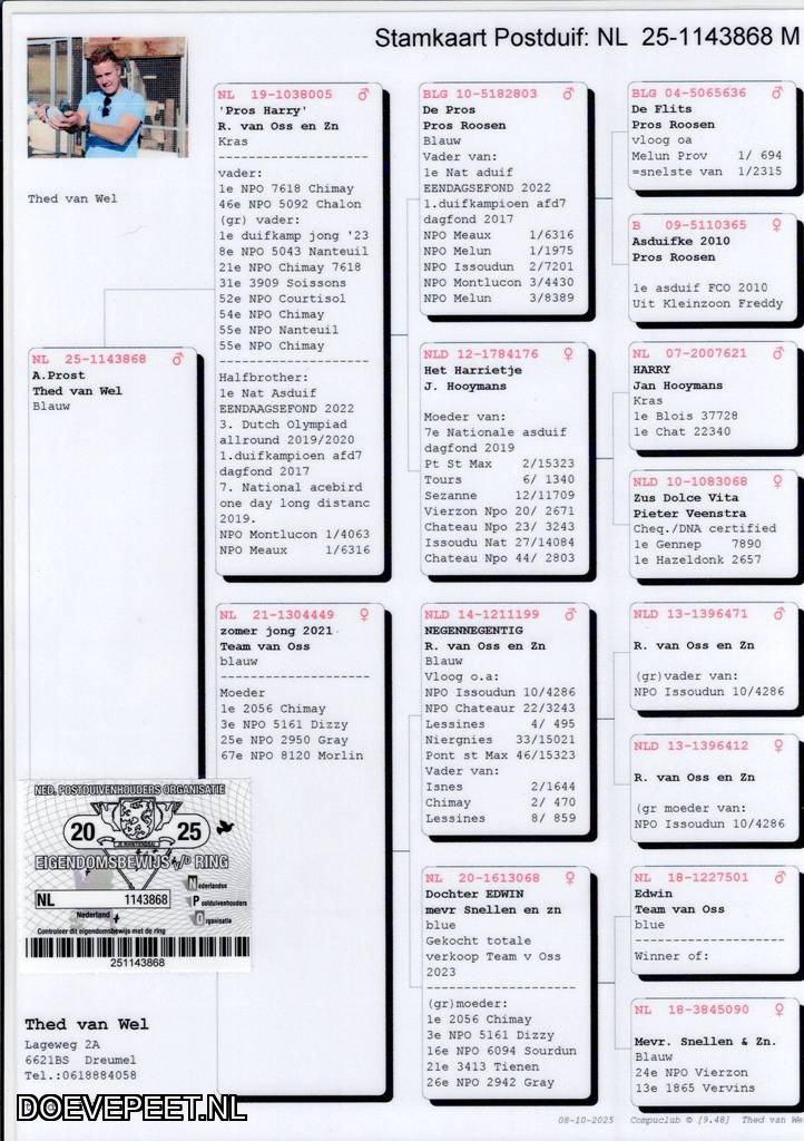 Thed van Dreumel is zelfstandig ondernemer in de verkoop, verhuur en onderhoud van aanhangwagens. Sinds enkele jaren heeft de 25 jarige Thed zich toegelegd op de dagfondvluchten en nu al hoort hij tot de te kloppen mannen op deze discipline met als hoogtepunt de 1e Nationale Asduif Dagfond (jongeren competitie). Gelukkig heeft hij aan zijn vader een grote steun in de verzorging van zijn duiven. Ondernemer zijn is mooi maar gaat wel ten koste van de vrije tijd. De huidige dagfondstam is opgebouwd met duiven van Jo van Uden uit Oss, waar Arie Wassink uit Nijkerk indertijd ook geweldige duiven van had, R. van Oss & Zn.,Velddriel waar hij in eerste instantie een aantal late jongen kocht en op hun succesvolle veiling via Pipa waar hij enkele toppers aanschafte waaronder Nettie-1e Nationaal Melun- en topkweker New Misquito. Ook van Jos Thoné werden duiven aangeschaft. Zowel in 2024 als in 2025 werden vele topuitslagen behaald op de dagfond in Afdeling 8 en Regio ZW ( o.a. 3e asduif dagfond) en niet te vergeten dus de 1e Nationale Asduif Dagfond (jongeren competitie).