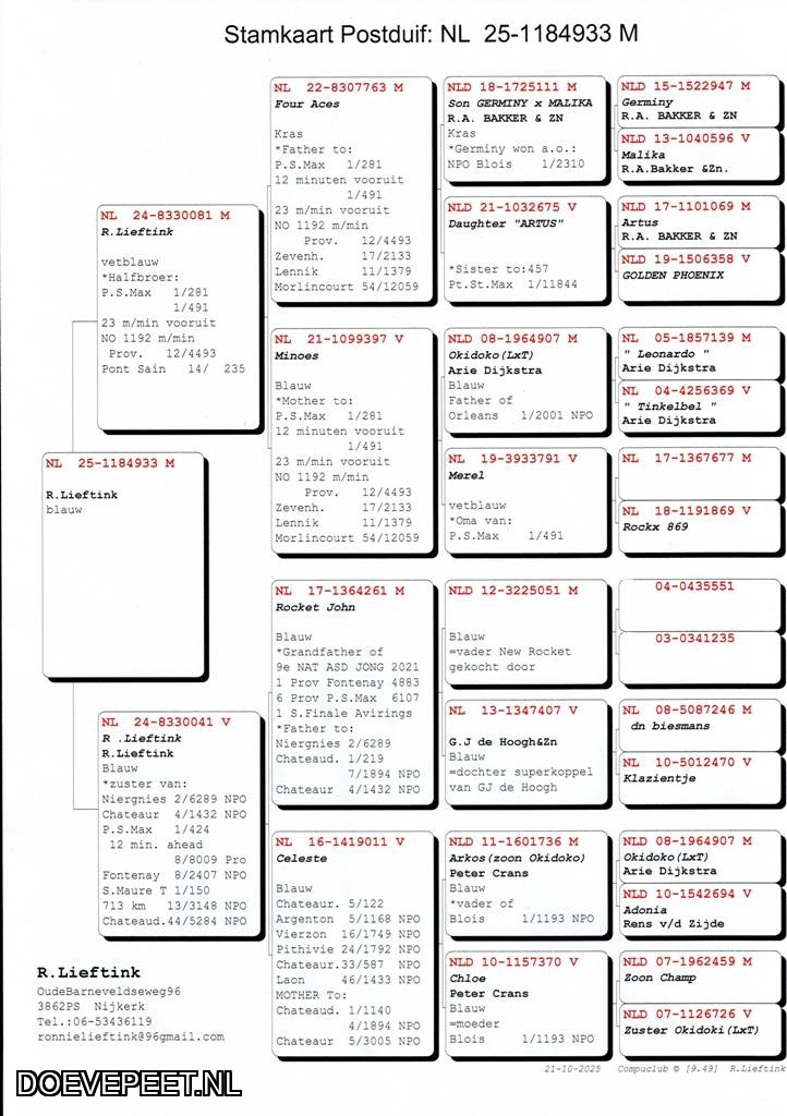 Ronnie schenkt ons een laat jong 2025 met een prachtige afstamming uit zijn enige tijd geleden aangeschafte duiven die vooral op de dagfond kunnen uitblinken. De moeder is zuster van een pure kopvliegster waar het gouden bloed van Rocket John van G.J. de Hoogh inzit maar ook van Okidoko van Arie Dijkstra. Ditzelfde Okidoko bloed vindt u in de vader waar ook de topduiven van R.A. Bakker & Zn. nadrukkelijk aanwezig zijn. Een pracht jong prachtige lijnen.