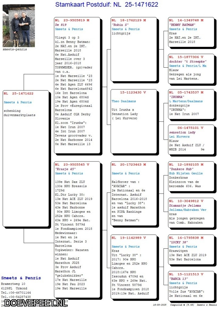 DMP Bon 124 Smeets-Penris – Stein Urmond – Jong 2025            Enkele TOPreferenties 2024!!! 1e NATIONAAL BERGERAC 28500 duiven (gebr Driessen) 1e Nationaal Agen z C (T&S Stoffels, Belgiė) 1e NPO Tarbes (Huub Moors)