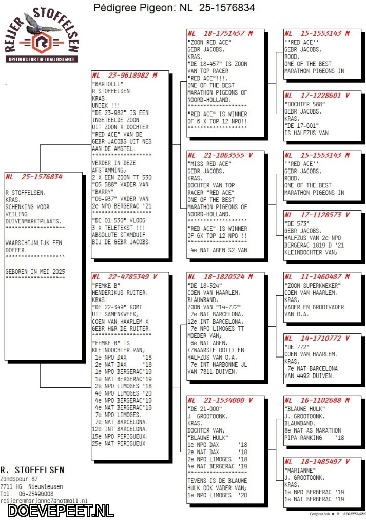 · “Leo” van Ben van Holland & Zn – 3x Teletekst en 1e duifkampioen Marathon Noord over 3 jaar 2015 t/m 2017. “Leo” stond gekoppeld aan de 1e Nationaal Bergerac 2024 !!!