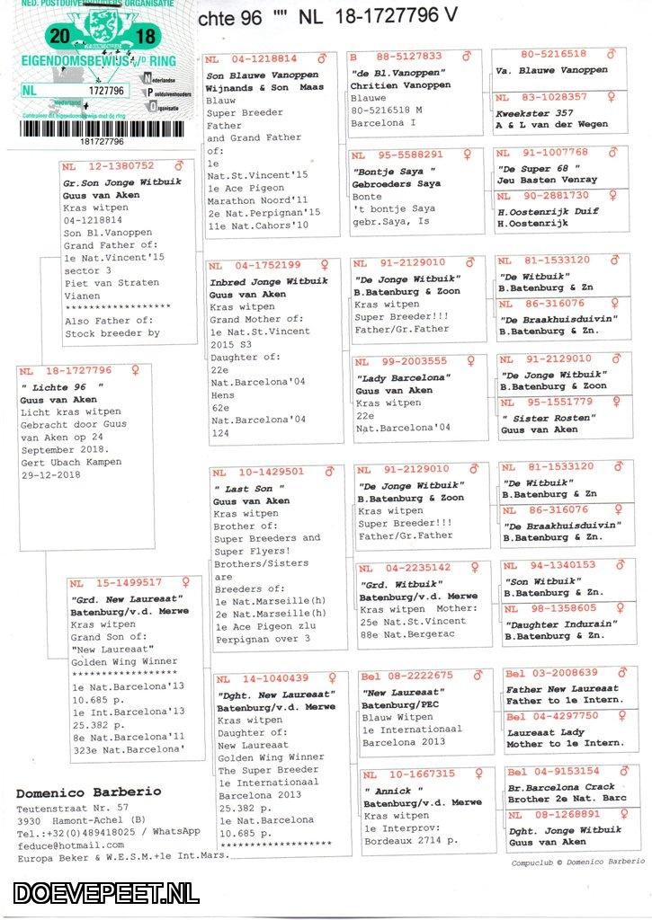 Vader: NL12-1380752 uit zoon Blauwe Vanoppen Vader en Grootvader v.d. 1e Nat. St. Vincent 2e Nat. Perpignan x Inbred Jonge Witbuik.