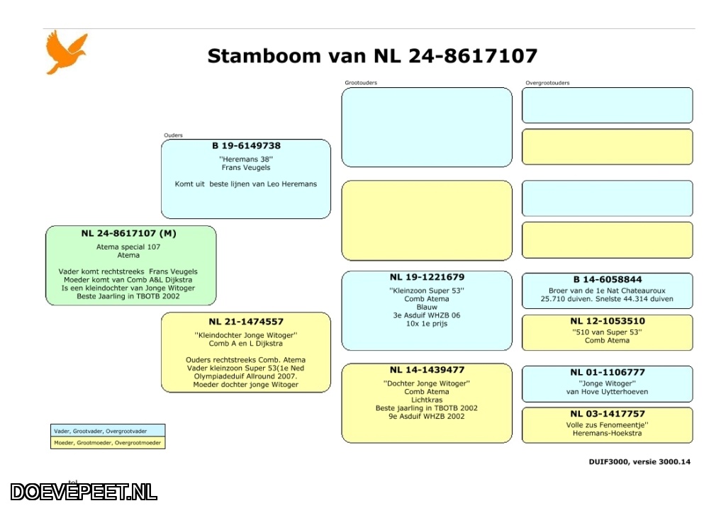 Koop 1: NL24-107 Doffer Vader: Is van het soort Leo Heremans. Helaas is de stamboom kwijt, dus verdere informatie ontbreekt. Moeder: Is een duivin bekomen bij de Comb A en L Dijkstra. Is gekweekt uit een dochter van Jonge Witoger(Beste Jaarling TBOTB 2002 en 9e Asduif WHZB 2002) maal een kleinzoon van Super 53. Beide duiven van Comb Atema.