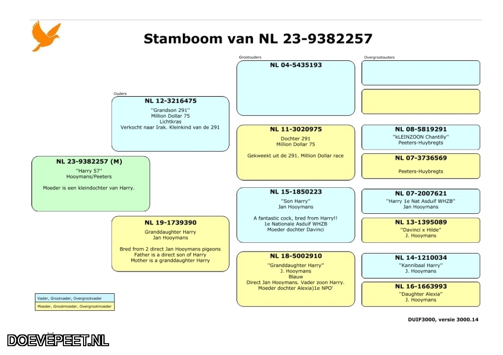 Koop 10 NL23-257 DofferVader:Is verkocht naar Irak. Is een kleinkind van de 291.Moeder: Is gekweekt uit 2 duiven van Jan Hooymans. Vader is een zoon van Harry. Moeder is een kleindochter Harry.