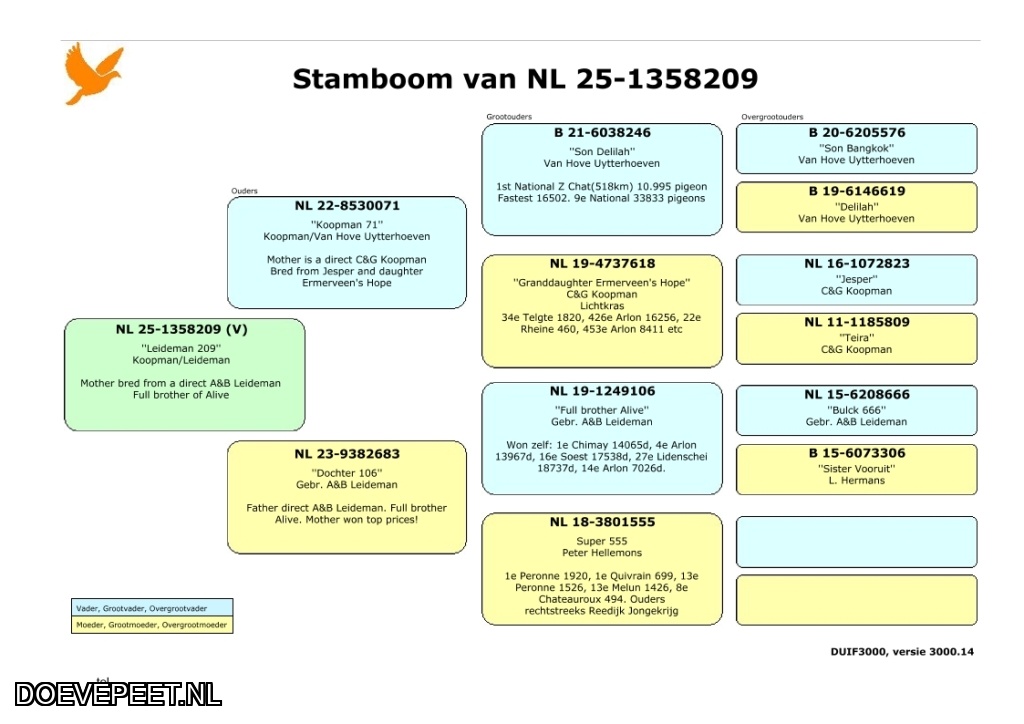 Koop 11 NL25-209 DuivinVader:Is gekweekt uit een rechtstreekse doffer van van Hove Uytterhoeven(zoon Delilah) maal een rechtstreekse duivin van C&G Koopman, kleindochter Ermerveen’s Hope.Moeder: (Koop 2)Komt uit een rechtstreekse van Gebr. A&B Leideman maal de Super 555GV: GUSTAVORechtstreeks van Gebr A&B Leideman. Won zelf o.a.:1e Chimay 14.065 duiven afstand 324 km 4e Arlon 13.967 duiven afstand 329 km 16e Soest 17.538 duiven afstand 158 km 27e Ludenscheid 18.737 duiven afstand 167 k...