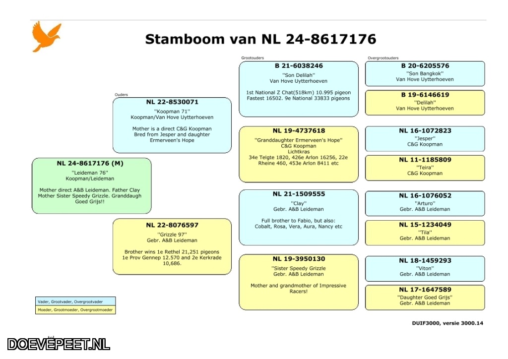 Koop 17 NL24-176  DofferVader:Is gekweekt uit een rechtstreekse doffer van van Hove Uytterhoeven(zoon Delilah) maal een rechtstreekse duivin van C&G Koopman, kleindochter Ermerveen’s Hope.Moeder: Rechtstreeks A&B Leideman. Volle broer wint 1e Rethel 21.251 duiven, 1e Prov Gennep 12.570 duiven en 2e Kerkrade 10686 duiven. Komt uit een kleindochter Goed Grijs