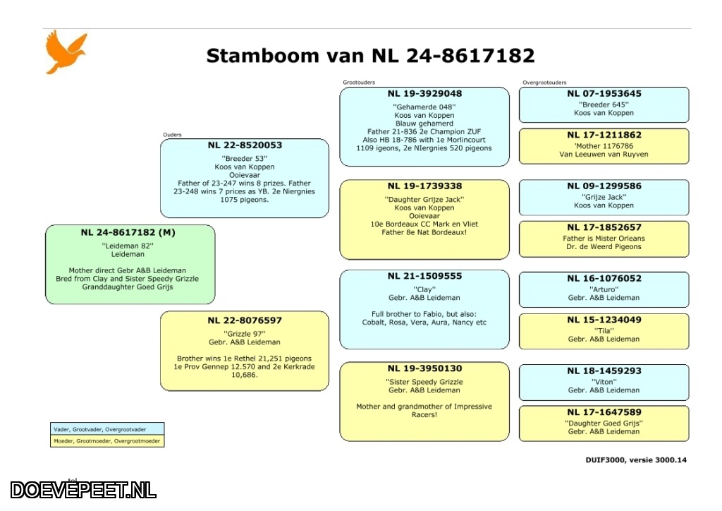 Koop 24 NL24-182 DuivinVader:Rechtstreeks Koos van Koppen, is vader van de 23-247(wint 8 prijzen) en de 23-248, wint 7 prijzen als jong. O.a.: 2e Niergnies 1075 duivenMoeder: Rechtstreeks A&B Leideman. Volle broer wint 1e Rethel 21.251 duiven, 1e Prov Gennep 12.570 duiven en 2e Kerkrade 10686 duiven. Komt uit een kleindochter Goed Grijs