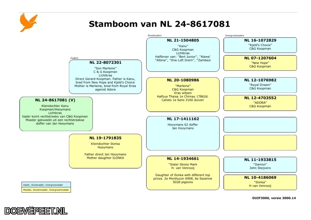 Koop 28 NL24-081 DofferVader:Rechtstreeks Gerard Koopman. Vader is Kanu, gekweekt uit New Hope en Kjeld’s Choice. Moeder is MarleineMoeder: Is een kleindochter van Ilonka: 2e Montlucon 6908 duiven, 6e Sezanne 5028 duiven etc