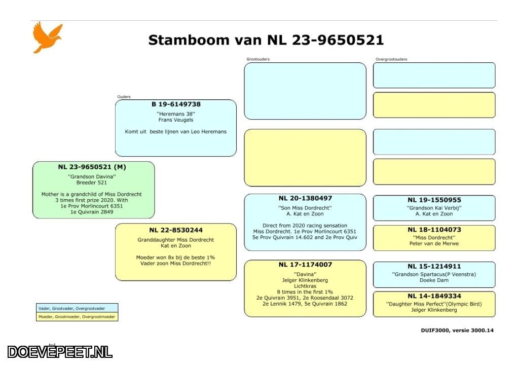 Koop 8 NL23-521 DofferVader:Stamboom is kwijt, van het soort Leo HeremansMoeder:Gekweekt uit een duivin van de Comb A Kat en Zoon. Is een zoon van Miss Dordrecht, 1e Prov Morlincourt 6351 duiven, 5e Prov Quivrain 14602 duiven, 2e Prov Quivrain 3111 duiven enz enz.Hij was gekoppeld aan: Davina: 8x prijs bij de eerste 1% 2e Quivrain 3951 duiven 2e Roosendaal 3072 duiven 2e Lenning 1479 duiven 5e Quivrain 1862 duiven 8e Morlincourt 4380 duiven 9e Peronne 3517 duive...